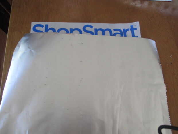 Primer lugar una hoja de estaño hoja 8 x 10 (no tiene que ser perfecto) y la pongo en el lado brillante, revistero.