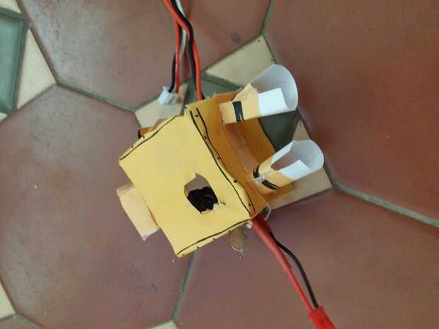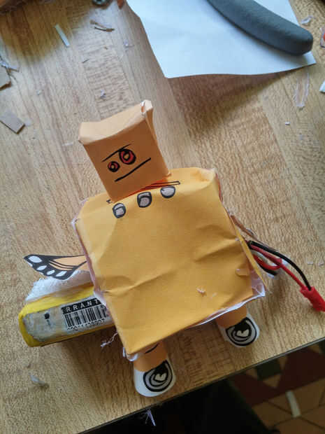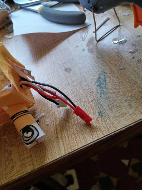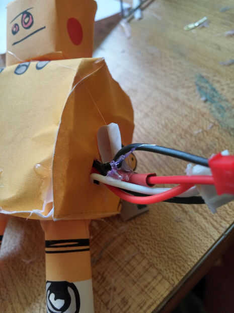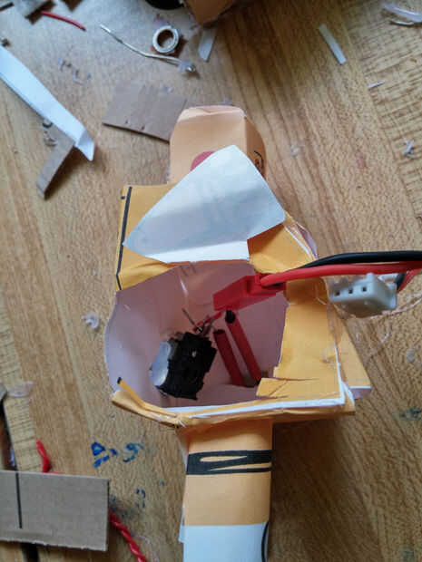 Este bit es donde el robot obtendrá su bombo. Corte un agujero en su lado bajo su brazo sólo lo suficientemente grande como para que la lipo que se utiliza para acceder al interior. Luego cortar un agujero en la espalda lo suficientemente grande para el botón que usas para entrar. Corte un pequeño agujero justo debajo del otro brazo para los plomos de la batería. Yo recomendaría que JST XT30 en lugar de los enchufes. Usé una lipo de 2S 850 mah de Hobbyking. Conseguir un macho y hembra JST y soldar los cables negro directamente entre sí. Los dos cables rojos para los dos cables del botón de la soldadura. Conectar la Lipo y empuje el conector no esté en uso a través del pequeño orificio debajo del brazo. Luego presione el botón a través del agujero pequeño para él y empuje el cable de carga a través del orificio que ha atravesado el otro conector. Pegar el botón en lugar y empuje la Lipo en el orificio para pegue el brazo robots en él. Luego pegue los cables que salen en el brazo de robots así.