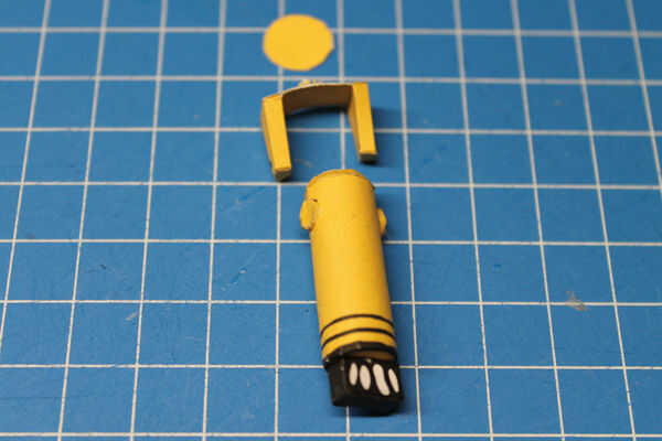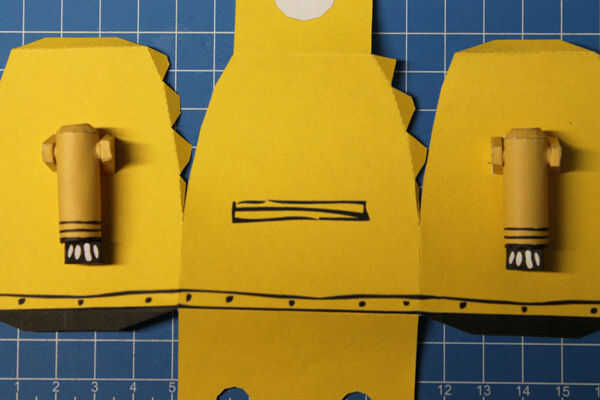 A continuación construir el mecanismo de hombro. Tenga cuidado de no pegar las solapas en la parte inferior de la parte superior. Construir el pequeño cilindro y poner a través del brazo. Luego pégalo al mecanismo de hombro. Poner las aletas a través del agujero del brazo y doblarlas hacia atrás. Pegar el círculo a las aletas otra vez y asegúrese de que puede girar!