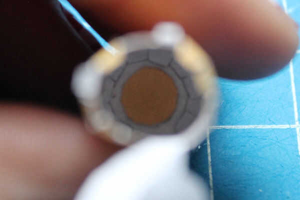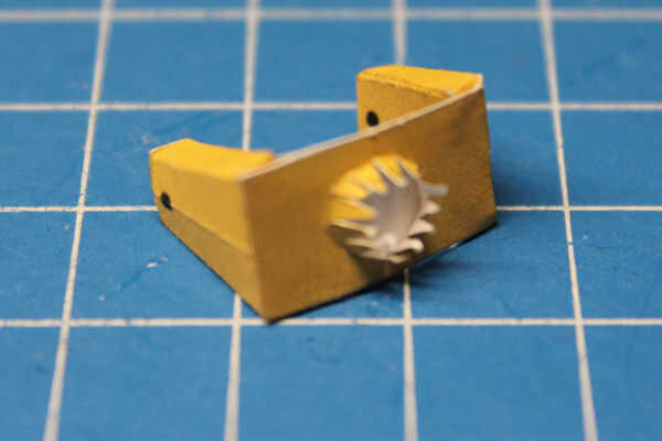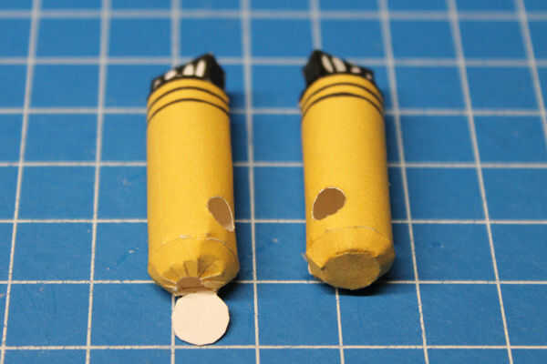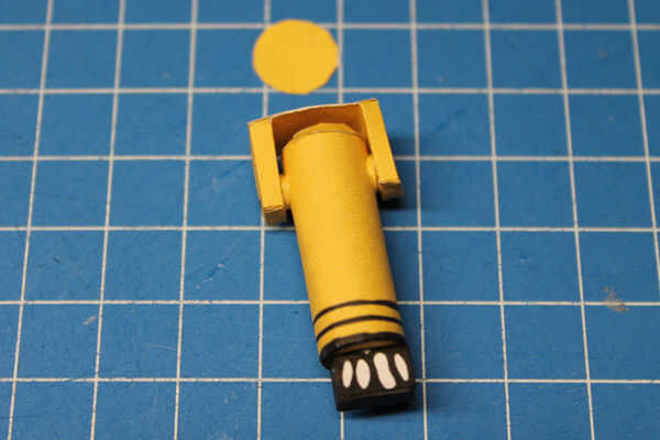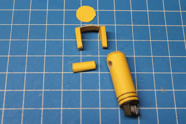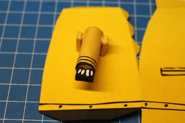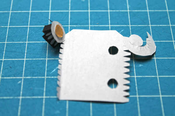 A continuación la pieza del brazo necesita rodar con un cilindro (lápiz) por lo que es agradable y redondo. Unir el cilindro del brazo. Cortar las aletas un poco más cortas y asegúrese de que las aletas no van sobre el círculo en el interior (de lo contrario no puede girar). Cierre el brazo.
