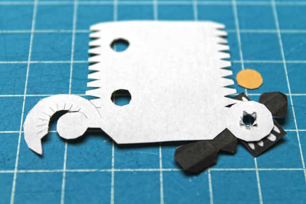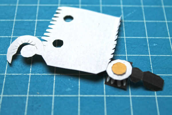 Comenzar con las manos (la parte más difícil de lo papercraft). Poner las aletas de la mano a través del agujero en la pieza del brazo y doblarlas hacia atrás. Recomiendo usar pinzas o la cuchilla de corte para hacer esto, porque son más bien pequeñas. Poner un poco de pegamento en la parte posterior de la pinza (o algo más) y poner ese pegamento en las aletas. Tenga cuidado de no pegar el círculo a otra cosa que las aletas por lo que puede girar. Asegúrese de comprobarlo y si está metida en algún lugar entonces encontrar el lugar y cortar el pegamento. Ahora usted puede pegar la mano juntos.