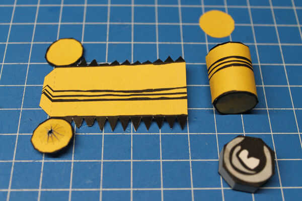 Ruede la pierna con un bolígrafo y unirlo todo. Puede cerrarla, pero asegúrese de que usted corte las aletas ya en el paso 3. Ahora poner las aletas a través del orificio de la parte inferior del cuerpo y doblarlas hacia atrás. Poner un poco de pegamento en las solapas y pegar el círculo a las aletas. Compruebe si puede girar. Pegar la rueda a la pierna, hacen que el lado correcto esté hacia arriba!