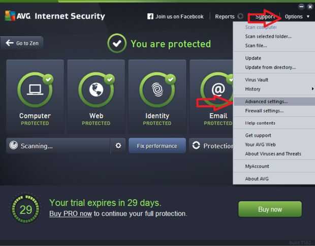 • Ahora voy a mostrar cómo deshacerse de esos molestos pop-ups que no necesita. Haga clic en opciones en la parte superior izquierdas de su programa AVG. A continuación, haga clic en "Configuración avanzada".