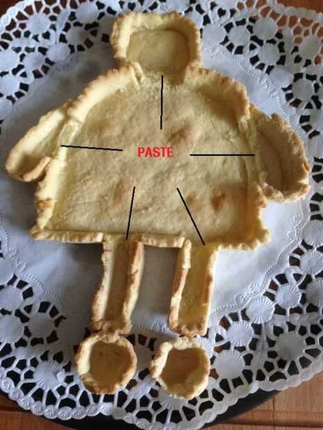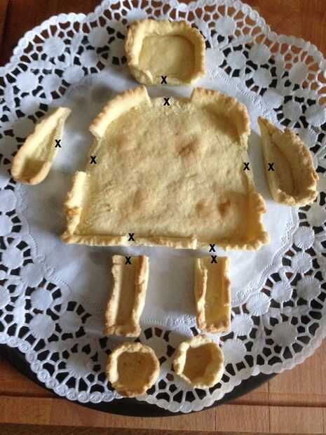 Ahora que este robot es en varias partes, es necesario hacer otra cirugía y fijar las partes del cuerpo juntas. Corte piezas pequeñas como se muestra (x) en la primera imagen. Mezclar mantequilla y azúcar glas juntos y pegar las partes del cuerpo juntas.