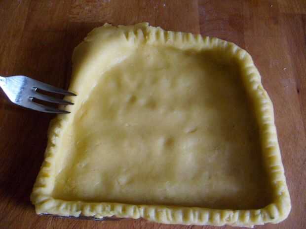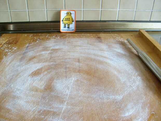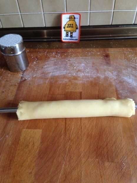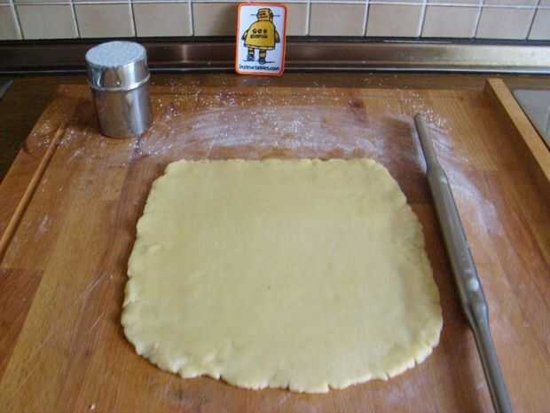 Enharinar la mesa, coge la masa de la nevera (después de 30 minutos) y rodillo. La manera fácil de poner en la bandeja es tomando la masa en el rodillo y cambio sobre la bandeja.