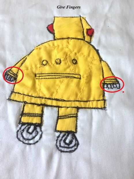 ¡ Ah! mi robot tiene los dedos y las ruedas. Coser a mano con hilo negro.