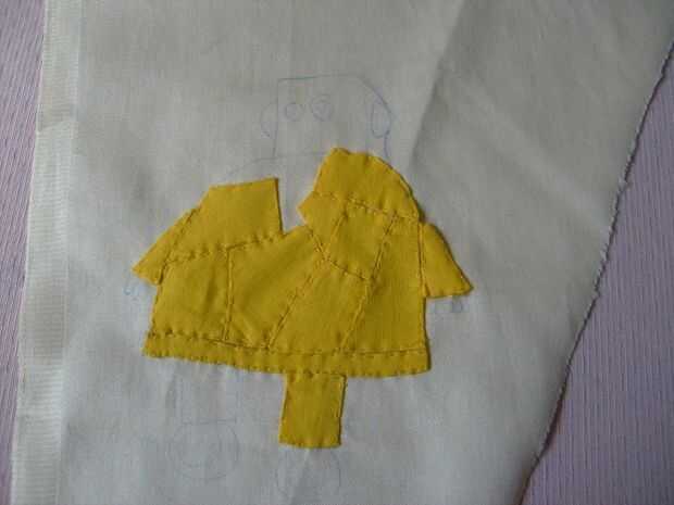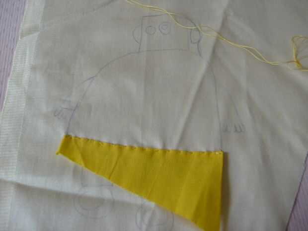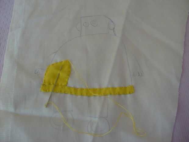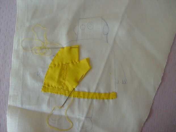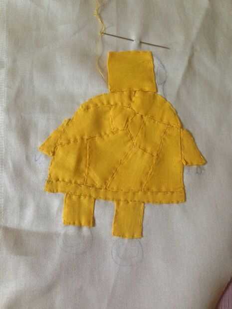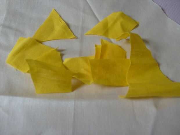 Lo fácil habría sido sobre pegamento a la tela amarilla. Pero quería hacer algo creativo. Así que empecé haciendo trabajo del remiendo. Esto es fácil y divertido y siempre me gustó coser. Cortar a la tela amarillo en trozos pequeños. Cortar en diversas formas y funcionó el parche según cómo eran las piezas. Si lo desea, puede cortar en el tamaño exacto de su elección y colocarlos en consecuencia. Me tomó sólo media hora ya que soy bastante rápido de costura en la mano. :)