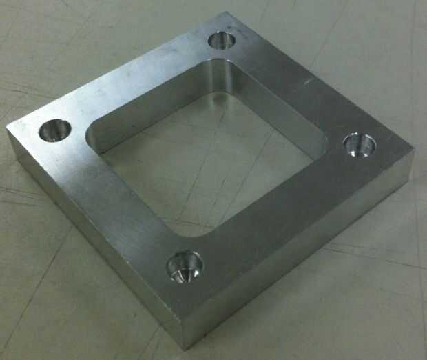 Las cuatro piezas trabajadas a máquina son el soporte del motor, el titular de la jeringa, la pieza de adaptador de jeringa de motor y la pieza superior. El soporte del motor fue mecanizado en un molino del CNC de Haas con un código relativamente simple de G & M creado con CATIA. Los cuatro rodamientos lineales donde encajan en los cuatro agujeros grandes en el soporte del motor y sostenido en lugar con dos clips c cada.