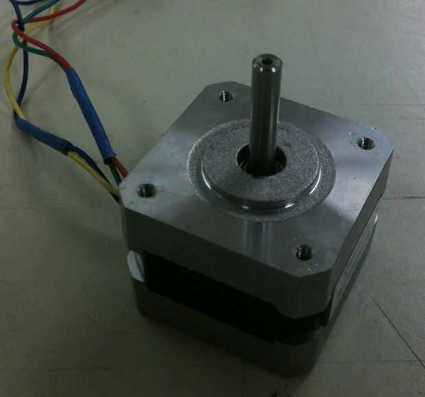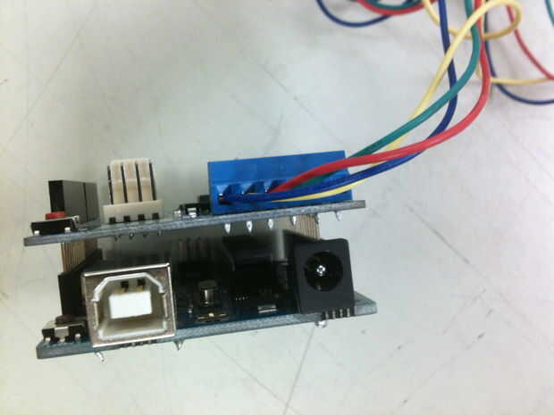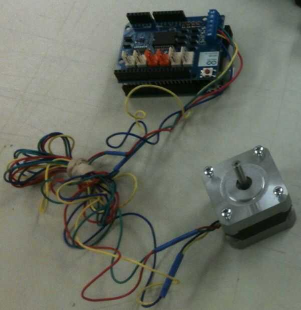 El motor tiene pasos de 1,8 grados (200 pasos por rotación) y se monta en el soporte motor con cuatro pequeños tornillos y sus cables se conectan directamente al escudo del motor Arduino. Broches de presión, tapones del escudo del motor a la derecha en la parte superior del tablero de Arduino Uno, que se conecta a un ordenador mediante un cable USB.