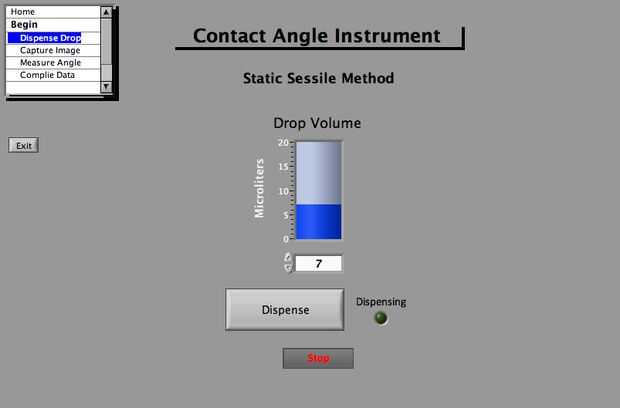 La interfaz en sí misma tiene varias páginas que pueden navegar a través de un menú en la esquina superior izquierda. La primera página es un mensaje de bienvenida que presenta la interfaz y proporciona un enlace que abre un PDF con el manual del usuario que escribió para el instrumento. La página siguiente contiene la caída de controles de dosificación. Esto es donde el usuario especifica el volumen (en litros micro) de la gota que se creará y luego crea la gota haciendo clic en el botón "Descargar". Dentro del programa, lo que está sucediendo es el volumen de entrada se divide por 5 (la jeringa produce 5 microlitros por turno) y multiplicado por 200 (motor paso a paso tiene 200 pasos por vuelta), que convierte el volumen en el número de pasos necesarios para crear el volumen especificado, y luego que se envía a la arduino a través de la interfaz LabiVIEW para Arduino (LVIFA) y enciende el motor. Las otras dos páginas contienen enlaces para abrir el software de captura de imagen y el software de medición de ángulo.