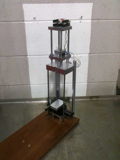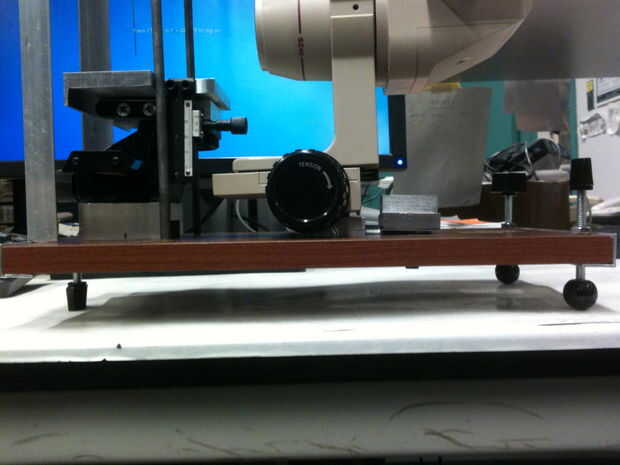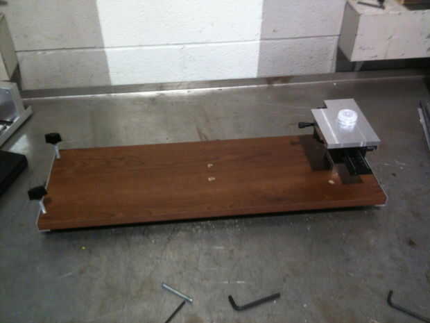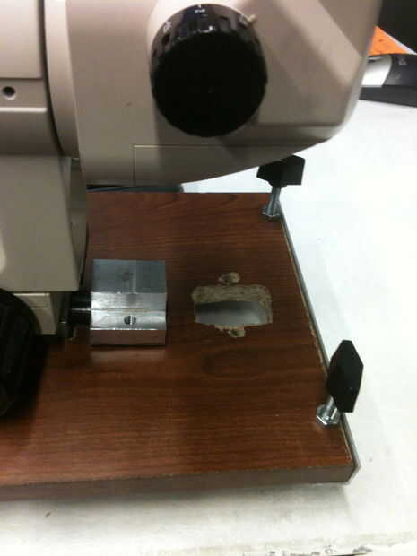 La base se hizo de un estante de madera, cortado al tamaño correcto con un varios agujeros perforados (algunos intervenidos) y un bolsillo rectangular, cortar con una dremel como router (para el montaje del microscopio). El sistema de aplicación se monta en la base con dos piezas de soporte de ángulo de aluminio y dos varillas de acero. También se incluyen en la base son los pies que se utilizan para nivelar el instrumento.