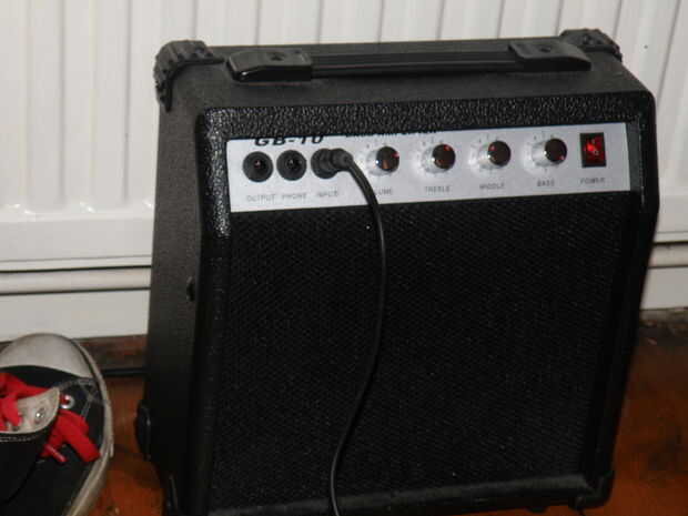 Haz la regla de metal y poner en la guitarra para que uno de los extremos es en la parte inferior del diapasón y la otra es sobre uno de las pastillas como en la foto 3.