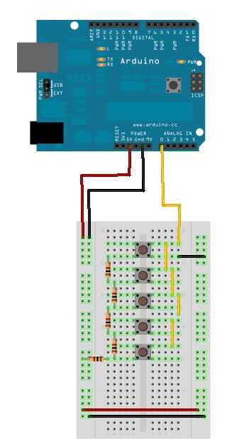 Cuando se ejecuta fuera de pins de I/O digital para interruptores puede crear un divisor del voltaje y añadir una pequeña cantidad de código para obtener muchos botones trabajando en uno de los pines analógico. El siguiente ejemplo muestra cómo 5 botones pueden ser identificados usando resistencias Ω de 1 K 5 y un pin analógico. Los valores de resistencia deben ser lo suficientemente pequeños para que no se demasiado actual a través de ellos pero lo suficientemente grande como para tener un circuito divisor de voltaje confiable y estable.
