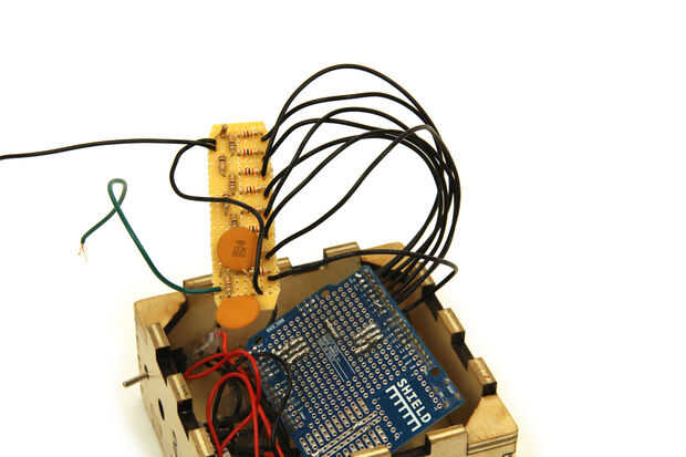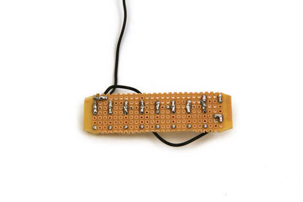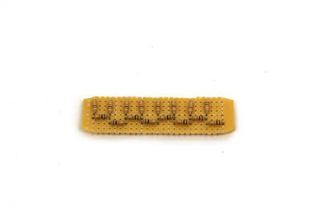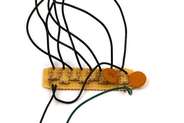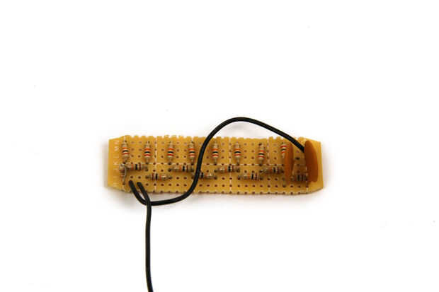 La escala de resistencia para este proyecto es un DAC de 8 bits. Como se puede ver en el esquema, Arduino PORT D (pines digitales 0-7) había salida 8 pedazos de datos (uno de cada pin) que se envían a cada cruce de la DAC. Soldó estas resistencias en un pedazo de cobre plateado protoboard que cortar a tamaño.