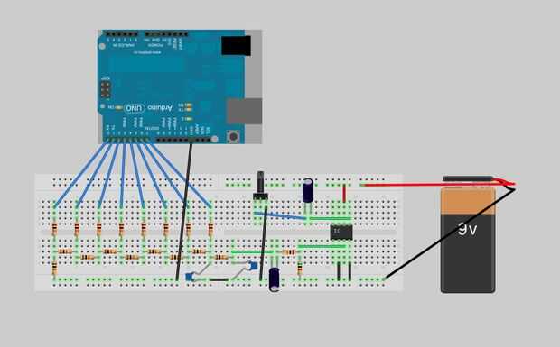 Hay 10 conexiones a la DAC, 8 pines de entrada digitales de arduino, salida de audio y tierra. El cable verde en la figura 6 es salida de audio, este cable se conectará al amplificador en el paso siguiente. Usted puede encontrar el archivo fritzing abajo.