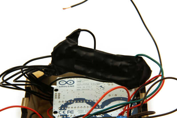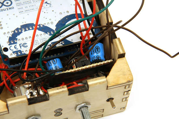Colocar todos los componentes de acabado en gabinete y asegure con pegamento si es necesario.  Usé pegamento para garantizar la salida de auriculares e interruptores.  Retire el pasador de lado de las macetas (figuras 3 y 4) y asegure con tuercas en el fuera del recinto (Figura 5).  Conectar la batería y caber dentro de recinto.  Cubrir los circuitos abiertos de la DAC y amplificador con cinta aislante para evitar cortos circuitos y caber dentro de recinto.