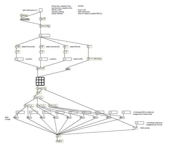 MaxMSP Runtime (es gratis y encuentra a la derecha de la página). En la aplicación, puede seleccionar su MIDI canal y cambiar los valores de nota y la velocidad de MIDI (vea los comentarios). Cuando se tiene el instrumento conectado a tu comp via usb y la aplicación que midiroute se inicializa correctamente, debería ver la luz de la rejilla naranja como presionas un botón. Si se ha cargado el firmware de arduino, deberá dejar de Arduino y luego brevemente Desconecte la conexión usb a tu ordenador y volver a conectar para establecer una conexión serial con MaxMSP.