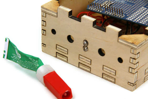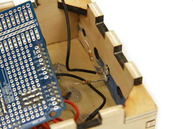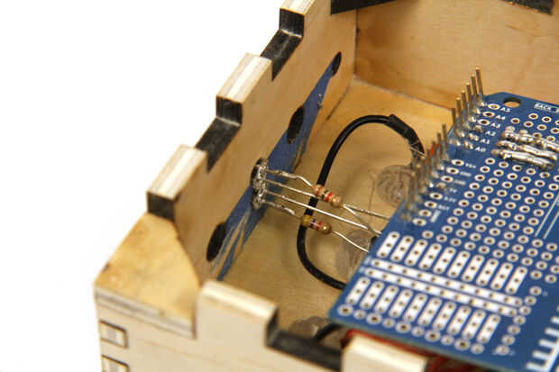 Conecte los conductores de más cortos de dos LEDs uno al otro (motivos) y conecte el conector de tierra de la protoshield arduino. Conecte un resistor limitador actual a cada uno de los conductores de más de dos LEDs. El valor de la resistencia óptima puede calcularse como sigue: