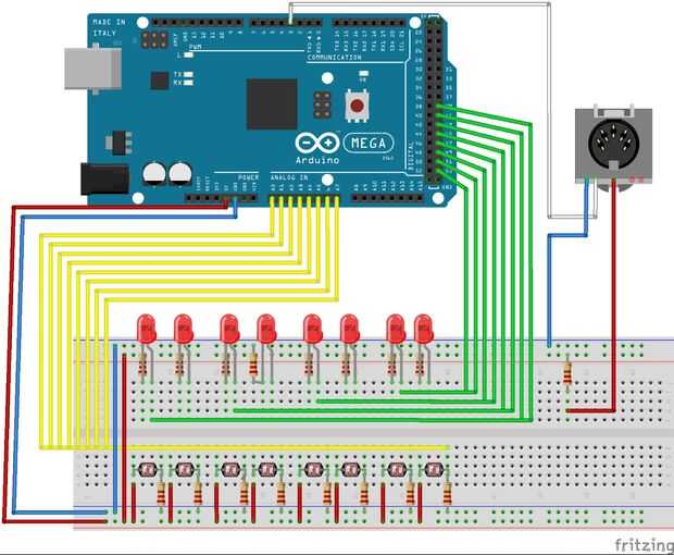 Tengo que construir el circuito mediante tablero de pan primero, como también hay muchos sueltos extremos que pueden causar dolor de cabeza más adelante. El diagrama es sólo para 8 entradas pero básicamente sólo tienes que copiar el proceso hasta llegar a su número de entradas que desea. Asegúrese de que usted conecte la salida MIDI a PWC ~ pin 3 en su Arduino como el código es para enviar una señal por el pin 3.
