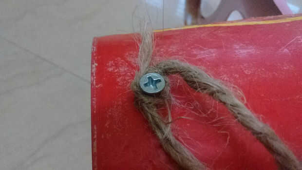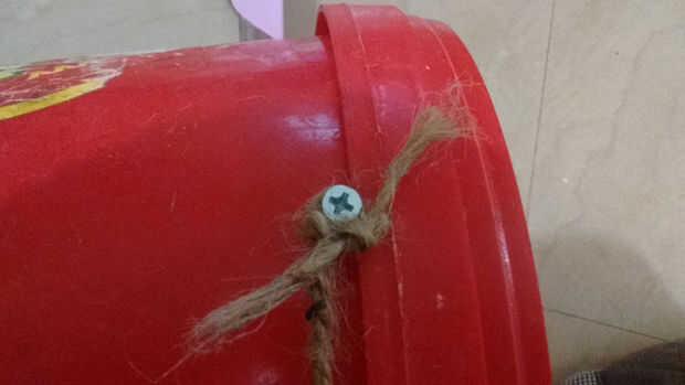 1 después de fijar todos los materiales al cubo, forman dos orificio superior de la canastilla y fijar el tornillo de la cubeta y atar el hilo al cubo como se muestra en la imagen.