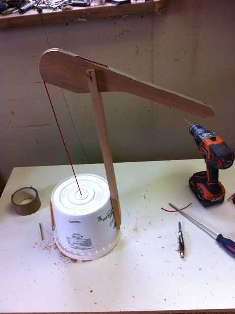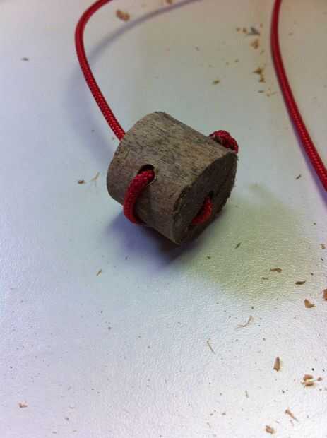 Para que el cubo durará más tiempo necesitará reforzar donde la cuerda pasa por el centro. Lo hice cortando un trozo corto de palo de escoba, taladrar un agujero de sólo lo suficientemente grande como para que la cadena a través del centro. He añadido un par más agujeros para complicar las cosas pero sólo podría el cable a través del centro del hilo de rosca y para detenerla deslizarse a través de un nudo.
