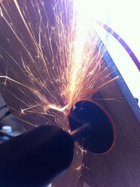 Una herramienta Dremel con un tambor de lijado y una ranura para el cable de la mentira en que va alrededor de la curva de la cabeza de la palanca, Ave.