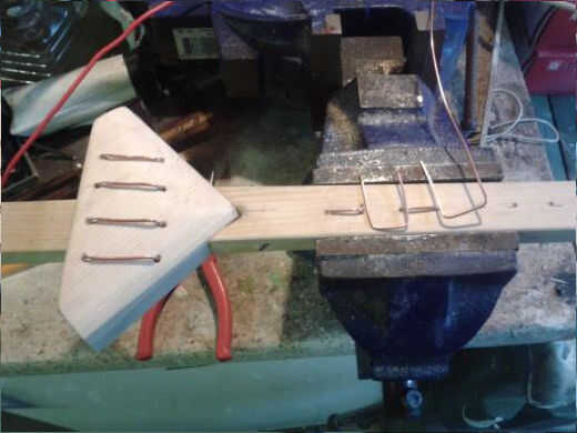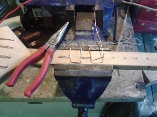Separadas longitudes de cable a través de cada juego de orificios de alimentación. Cada vestido debe ser tiempo suficiente para que pase a través de la parte delantera del traste y luego doblar sobre sí mismo para formar un bucle, como se muestra. Experimentamos para encontrar la longitud correcta del alambre entonces corte a igual tamaño antes de alimentarlo a través de los orificios perforados.