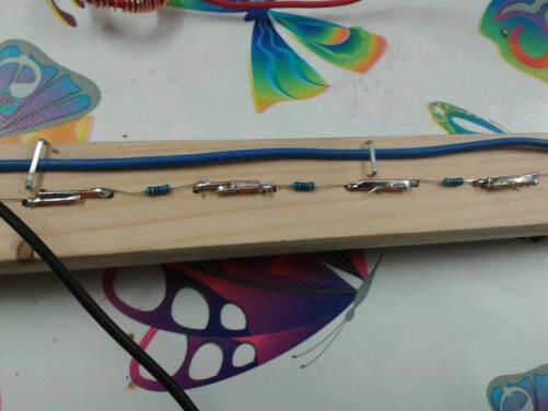 Soldar nuestras resistencias en su lugar - pero no te preocupes si no se puede soldar. También podría envolver las resistencias firmemente entre los alambres de traste entonces doble sobre y fíjelos con un thumb tack. Para calcular las resistencias correctas a utilizar, tenemos que echar un vistazo a cero (que hicimos usando un Raspberry Pi pero también se puede hacer en un PC).