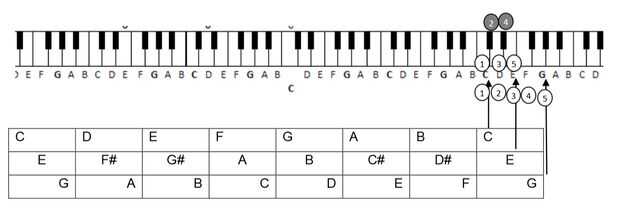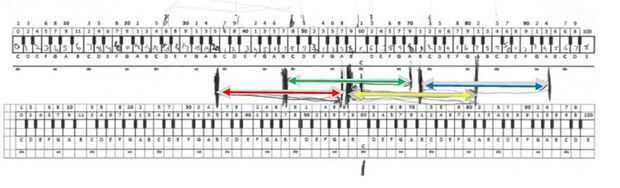 Cero hace un buen trabajo de síntesis de sonidos de instrumentos, pero para dar cosas profundidad extra un poco decidí hacer cada 'cadena' de la obra de Piolin un acorde simple. Acordes de simple trabajan contando 5 notas (para incluir las notas sharp negro) y 5 blancas.