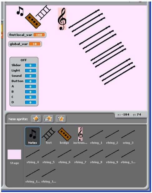 Mi proyecto de scratch tiene un sprite para mantener las dos listas de notas, una para el control de traste, para el control de puente, un sprite – llamado instrumento – la cual establece los valores globales para el instrumento, para hacer que suene como un violín por ejemplo. También son doce los sprites que he llamado string_1 a string_12. Estos duendes, cuando dispara, ven el valor de la nota correspondiente de la lista correspondiente y luego "jugar".
