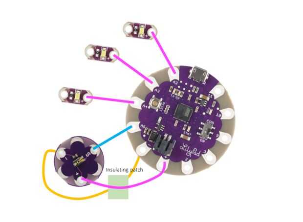 b. empezar por comprobar si el sensor funciona colocando Led con la Junta de Lillypad con pinzas de cocodrilo.