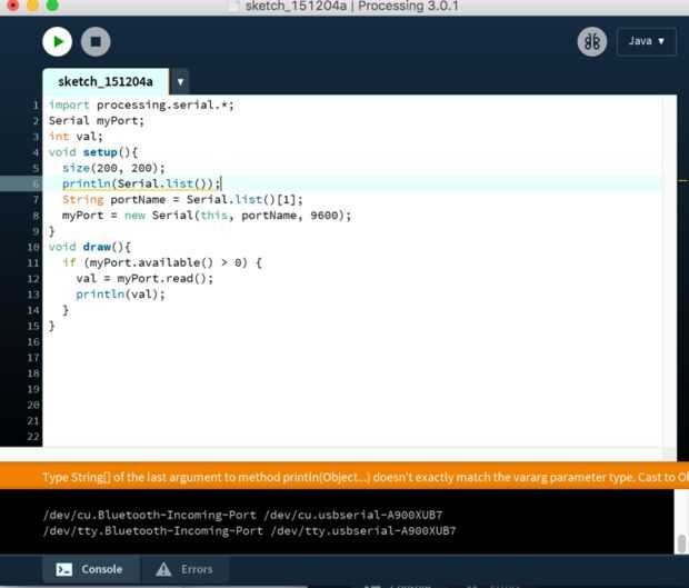 Antes de avanzar a la parte inalámbrica, es necesario conectar el Arduino con el proceso. Se proporciona el código de procesamiento hacia el final de esta sección. Siga los pasos siguientes para hacer Arduino comunicarse con el proceso.