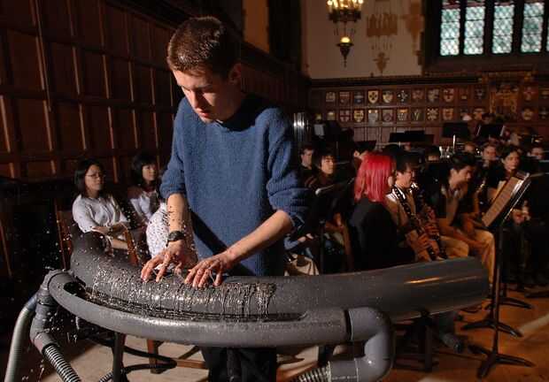 Algo me molestó acerca de esta clasificación porque las dos primeras hacen sonidas de vibraciones de materia sólida y el tercero del viento (materia en estado gaseoso). Así que me dije, "como la tres Estados-de-la materia, sólido, sólido, gas y?". Y entonces dije "¿Qué tal un instrumento musical que hace sonido de vibraciones en el líquido?" y todos tipo de se reían de mí. Y cuando le pregunte a algunos ingenieros dijeron que puesto que los líquidos son incompresibles, lo que estaba proponiendo era imposible. Pero si el agua tiene exactamente cero compresibilidad la velocidad del sonido en el agua tendría que ser infinito, que no es. Así que una de mis pasiones de niñez fue hacer por primera vez en la historia humana, un instrumento musical hizo sonido de vibraciones en los líquidos. Terminé haciendo cientos de diferentes tipos de instrumentos: waterflute, CLARINessie (instrumento de la solo-caña de agua), H2Oboe (instrumento de multi-lámina agua) y H2órgano (órgano de tubos bajo el agua); era bastante diferentes para hacer una sección entera en una orquesta, creando así el "H2orquesta" (adicional de enlace).