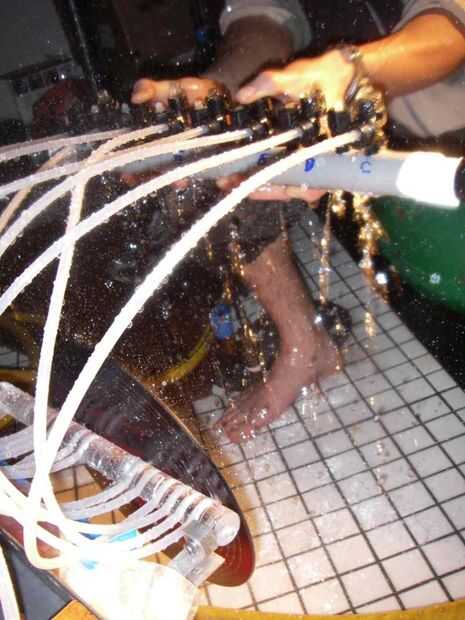 Por último, conectar la descarga lateral de cada "t" conexión a una manguera que va al disco. Ahora tienes 12 mangueras que van al disco.