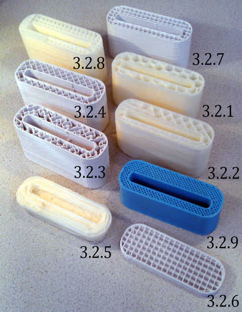 En la foto de arriba, puede ver mi opinión en impresión 3D ' bloques de madera '. Cada uno de ellos tiene un patrón diferente relleno . Descubrí que debido a estas distintas formas todos sonaban muy diferentes! Usando este principio, es posible imprimir un bloque de madera con cualquier tono que desee. Lamentablemente, el tiempo que tenía disponible era sobre por lo que no pude seguir pero usted puede comprobar la wiki, el Informe, la guía y la publicación que hice sobre este.