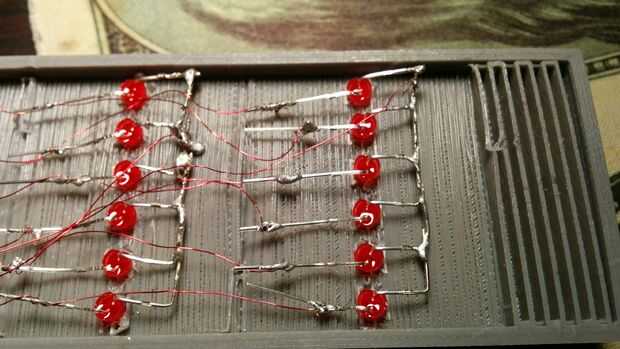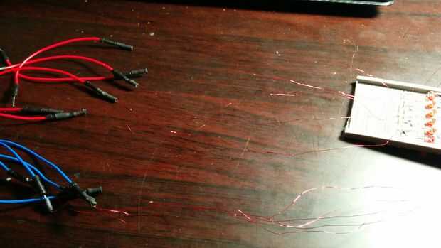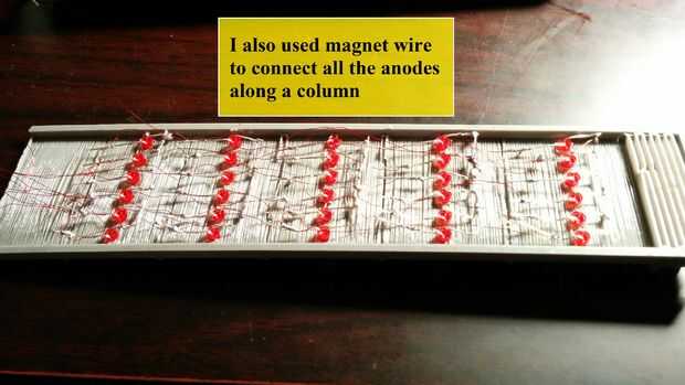 Quiero sauter y conectar los LEDs según el cuadro de matriz de LED. Esto se denomina Multiplexión por lo cual, todos los cátodos y los ánodos de cada fila y columna están conectados. Conecté todos los cátodos de una fila por sautering les juntos y conecta todos los ánodos de una columna con alambre magneto. Entonces conecté los cables de la seis columna (cada conexión todos los ánodos de una columna) a seis cables (rojos en la imagen) y cinco filas (cada uno conectado a la conexión del cátodo de sautered) a los cinco cables (azules en la imagen). Yo les aseguró usando calor encogen. Este método reduce el número de alambres, y, como resultado necesario el número de pines del Arduino, 11 (6 + 5).