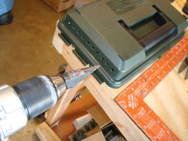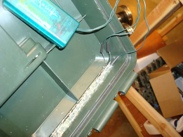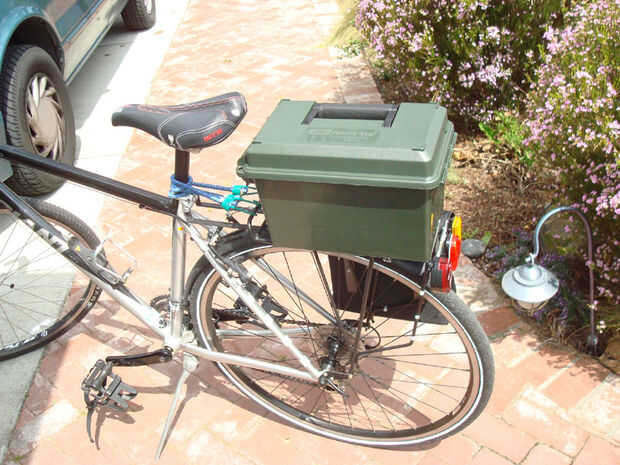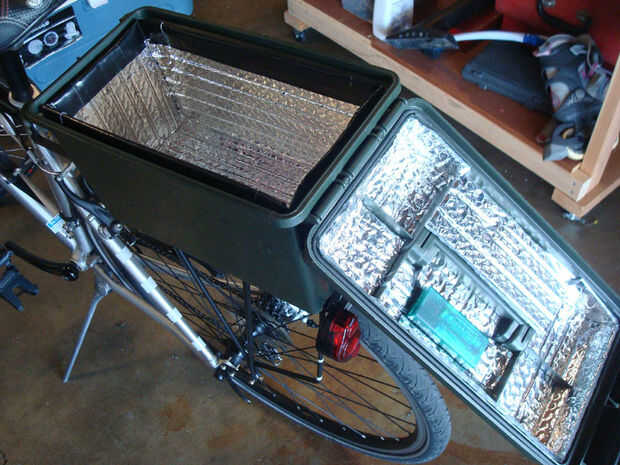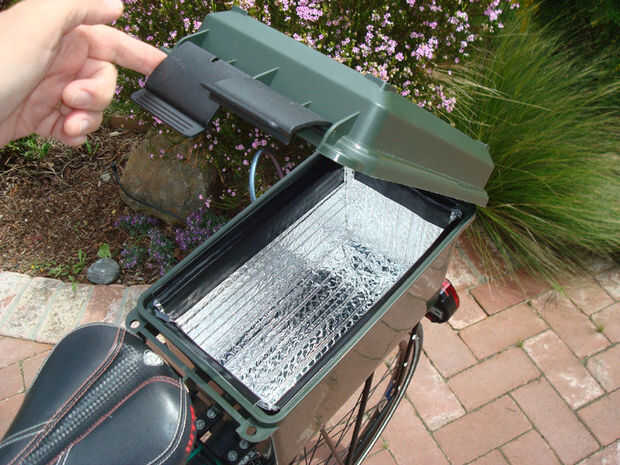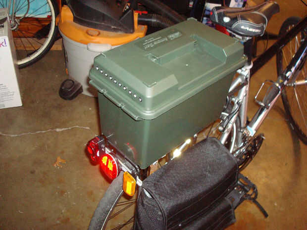 Justo a tiempo para la primavera! Este Instructable es un tronco de bonita bicicleta con cerradura de una caja de munición de plástico ligero que puede usarse para hacer un picnic o en mi caso transportar mi almuerzo. Trabajo cambio de swing y a casa por la noche así que quería ilumina así. El inserto aislado sale para la limpieza y las luces son un re-purposed pilas intermitente secuencia ligera de la Navidad que me dieron en Walgreens última Navidad para barato. He quitado las mierda luces coloridas y reemplazándolas con rojo y amarillo LED ultrabrillante que es realmente brillante.