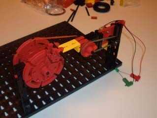 Con los enchufes de fischertechnik adjuntados, se puede integrar el LED en una variedad de modelos. Este es un simple generador accionado por correa, utilizando los elementos del kit Eco Power.