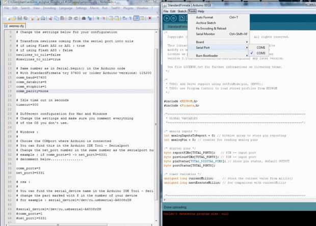 # Config archivo serproxy # Convertir saltos de línea que vienen del puerto serial en nils newlines_to_nils = false # Mismo número como en Serial.begin() en el código de Arduino comm_baud = 57600 # Ociosa tiempo de espera en segundos tiempo de espera = 300 # Configuración diferente para Mac y Windows # Windows: comm_ports = 3 # osx: #serial_device1=/dev/cu.usbserial-A6008rZN