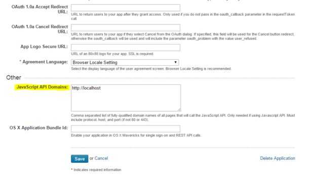 Después de crear la aplicación, debe establecer el campo "Dominio de JavaScript API" de su aplicación. En el campo, introducir la URL de su sitio web, utilizo http://localhost para este artículo.