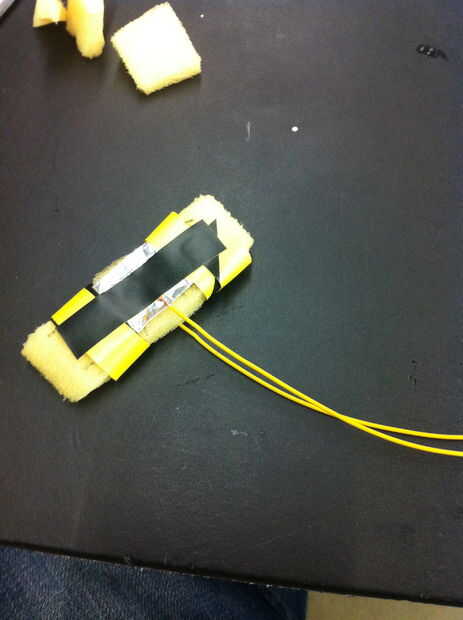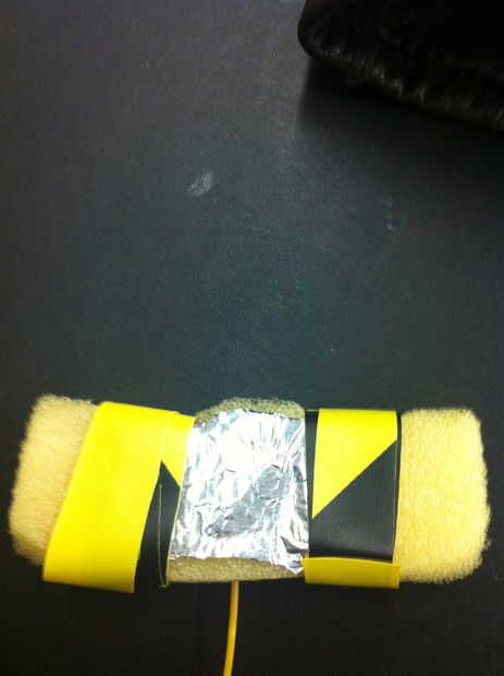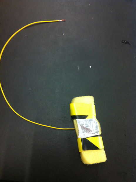 vervolgens bevestig je de draadjes met een stuk plakband de cinta aan een klein stukje zilverfolie.