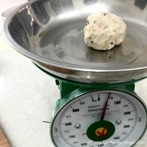 Utilizando la báscula para pesar cada trozos pequeños de masa asegurará el acabado bollos cocidos al vapor para ser del mismo tamaño.