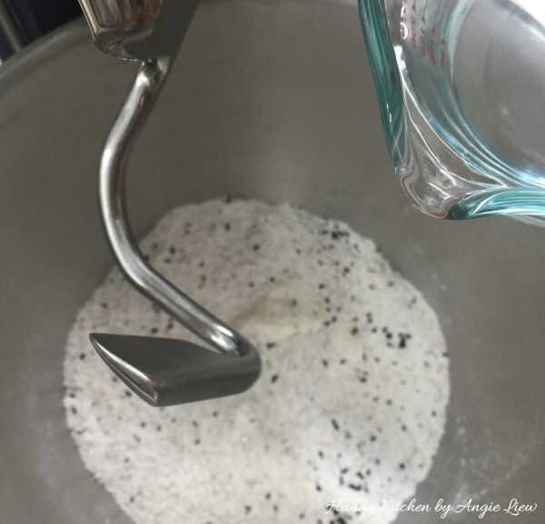 Paso 8: Coloque el bol para mezclar en una batidora con un gancho de masa pegado. Luego agregue lentamente en el agua.