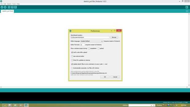 Ahora abre el IDE de Arduino y Presione ctrl+,(comma) y un prereferences se abrirá la ventana aquí encontrará ubicación Sketchbook y cambia la ubicación de carpeta de bocetos a E:\Documents\Arduino\tools\ArduBlockTool\tool\ardublock-all.jar luego presione "OK".