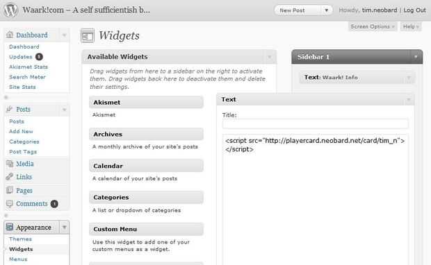 En el caso de wordpress, añade un widget de texto y pegar el código generado en el sitio de http://playercard.neobard.net !