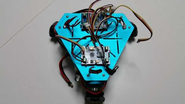 Montar el panel superior en la parte superior del robot. El codificador, altavoces y cables de batería nivel sentido a través del orificio central del hilo de rosca y enrosque los cables del motor a través de orificios de esquina que conveniente para las conexiones del motor en los controladores de motor. Que tenga que envolver la longitud excesiva de los cables del motor alrededor de los separadores verticales. Atornille el panel superior. Opcional: use armario de hilo (azul, el plástico de seguridad) en los tornillos del armazón.