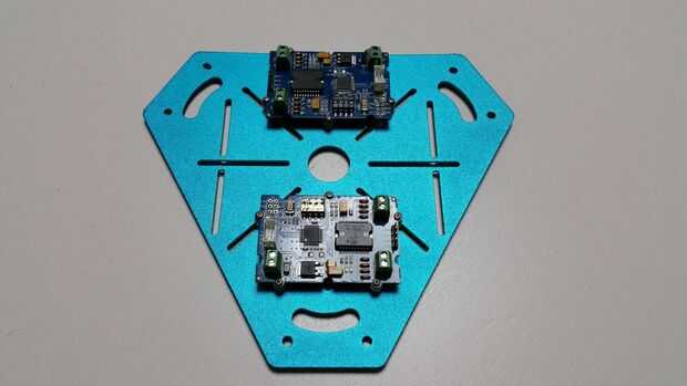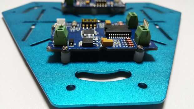 Desempaquetar la estructura de Nexus 3WD Omni y montar dos controladores de motor de Grove en el panel superior, utilizando cinco 2,6 mm tuercas y tornillos y espaciadores de plástico cinco cada uno. Necesita los espaciadores de plástico a la parte inferior de los controladores de motor de no tocar la estructura, de lo contrario se corta hacia fuera.