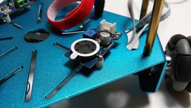 Monte el módulo de altavoz en la parte inferior del marco mediante tres tornillos de 2,6 mm, tuercas y separadores de plástico. También se pueden ver algunas tiras de velcro en la imagen que vamos a utilizar más adelante para montar la batería.