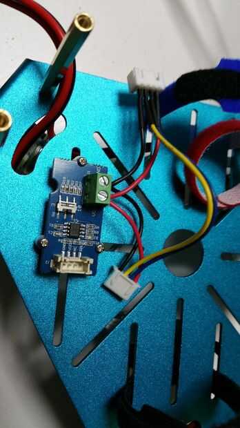 Monte el módulo de divisor de tensión de Grove en el lado opuesto el módulo de altavoz en la parte inferior del marco. Puede selecionar el escalamiento en el divisor de tensión x 3 o x 10. La imagen muestra 10 x pero terminé usando x 3 ya que da mejor resolución. Sólo funciona si lo configurar la interfaz de Edison/Grove para 5V (que tienes que hacer de todas maneras como el motor controladores sólo funcionan a 5V).
