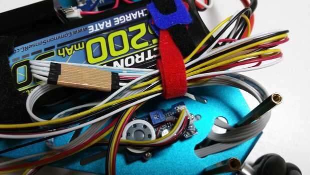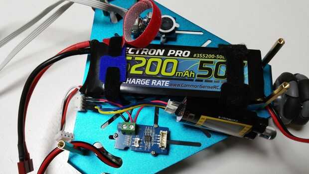 Nota aquí usé una batería bastante grande, un 5200mAh 11.4V batería 3S, ya que planea utilizar esta construcción particular para demostraciones todo el día. Sin embargo, una batería más pequeña, digamos un 2200mAh, está bien. Por el contrario, hay espacio para una batería aún más grande si quieres. Además, aunque los motores no son tan alegre si haces esto, también es posible ejecutar el sistema de un 2S (7.4V) batería, pero consigue un 3 si se puede.